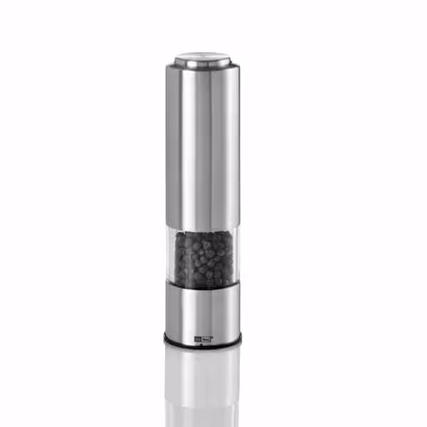 AdHoc Elektronische Salz - und Pfeffermühle mit Licht. H: 19cm Ø5cm. Mit robustem, verschleissfreiem Keramik Mahlwerk. Inkl. 6 Batterien. Edelstahl/Acryl.