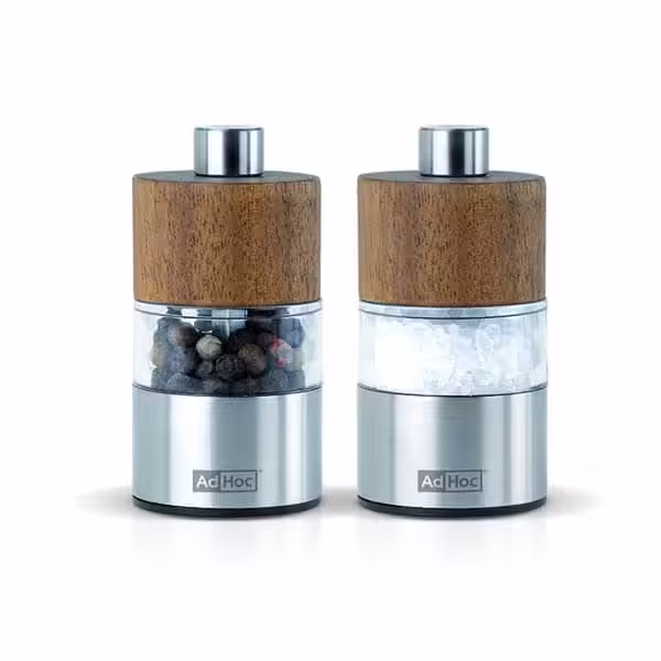 AdHoc Mini Menage. Salz- und Pfeffermühle. H: 6.2cm. Edelstahl/Acryl/Akazienholz. Mit robustem, verschleissfreiem Keramik Mahlwerk.