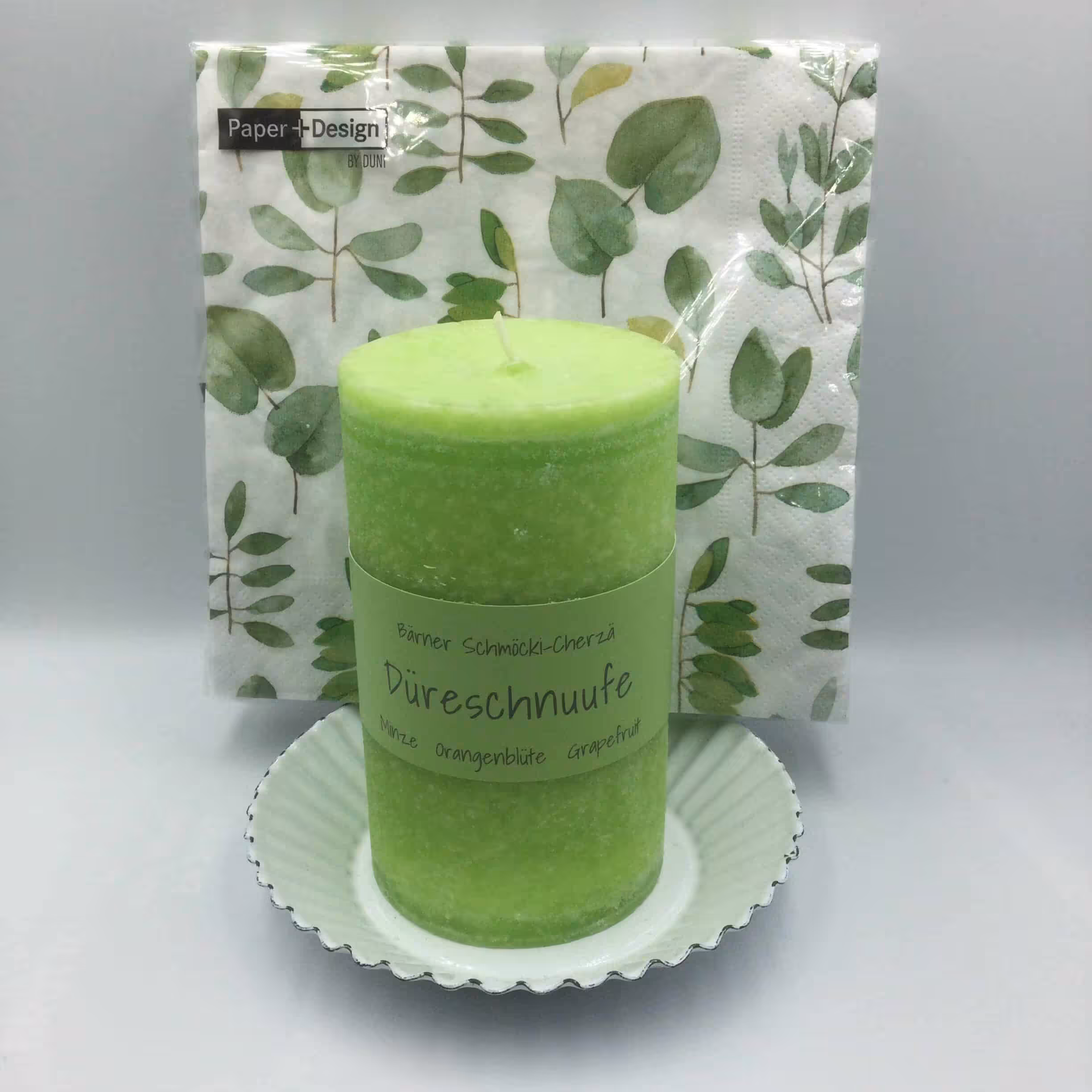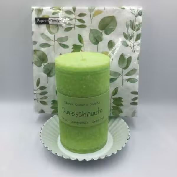 Bärner Schmöcki Kerze 12cm „Düreschnuufe“ mit Metallteller weiss und farblich passenden Servietten 33x33cm. (Sujets Servietten kann abweichen vom Foto)