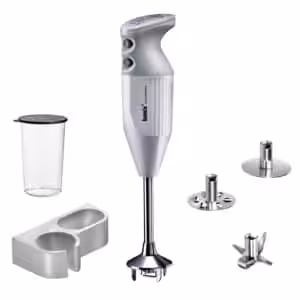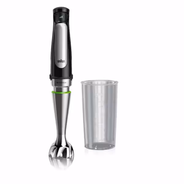 Smart Speed Technologie. Je stärker der Tastendruck, desto höher die Leistung. Mixstab aus Edelstahl. Mixbecher 0.6dl.