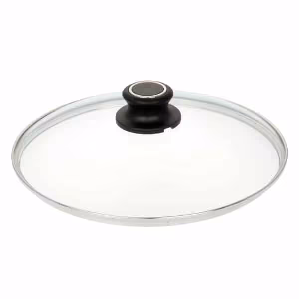 Glasdeckel mit Chromrandeinfassung. Belüftung im Deckelknopf. Ofenfest bis 260 Grad.