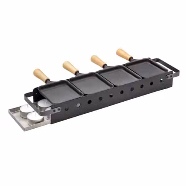 Raclette mit 4 antihaftbeschichteten Pfännchen, praktischer und mobiler Edelstahlbehälter für die Rechaudkerzen, inkl. 4 Spachtel