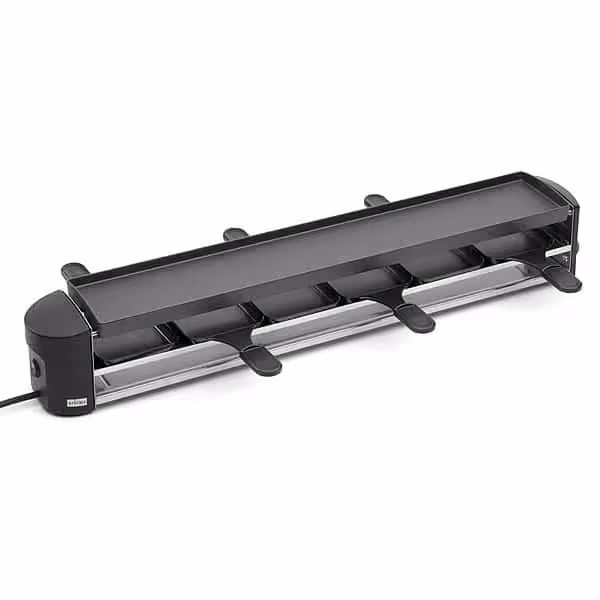 Mit antihaftversiegelter Grillplatte, Raclettepfännchen aus Stahlblech antihaftversiegelt, mit patentiertem Parkdeck, für 6 Personen, mit Verpackungshülle.