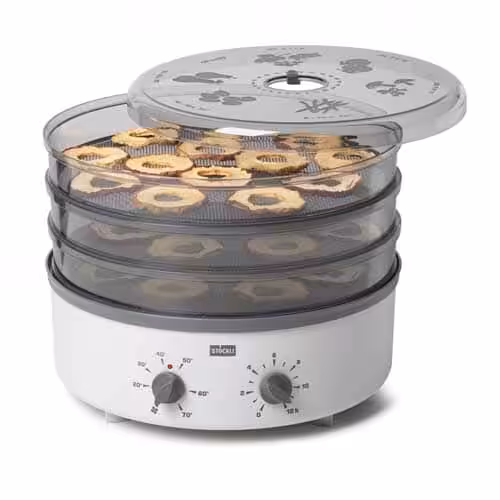 Mit 12 Stunden-Timer, stufenlose Temperatur-Feineinstellung, aktive Warmluftzirkulation, pflegefreundliches Kunststoffgehäuse, inkl. 3 Kunststoff-Dörrgitter, LED-Anzeige, verschiedene Dörrzeiten für das jeweilige Dörrgut sind auf dem transparenten Deckel eingeprägt, Gerät kann mit bis zu 10 Dörrgittern betrieben werden